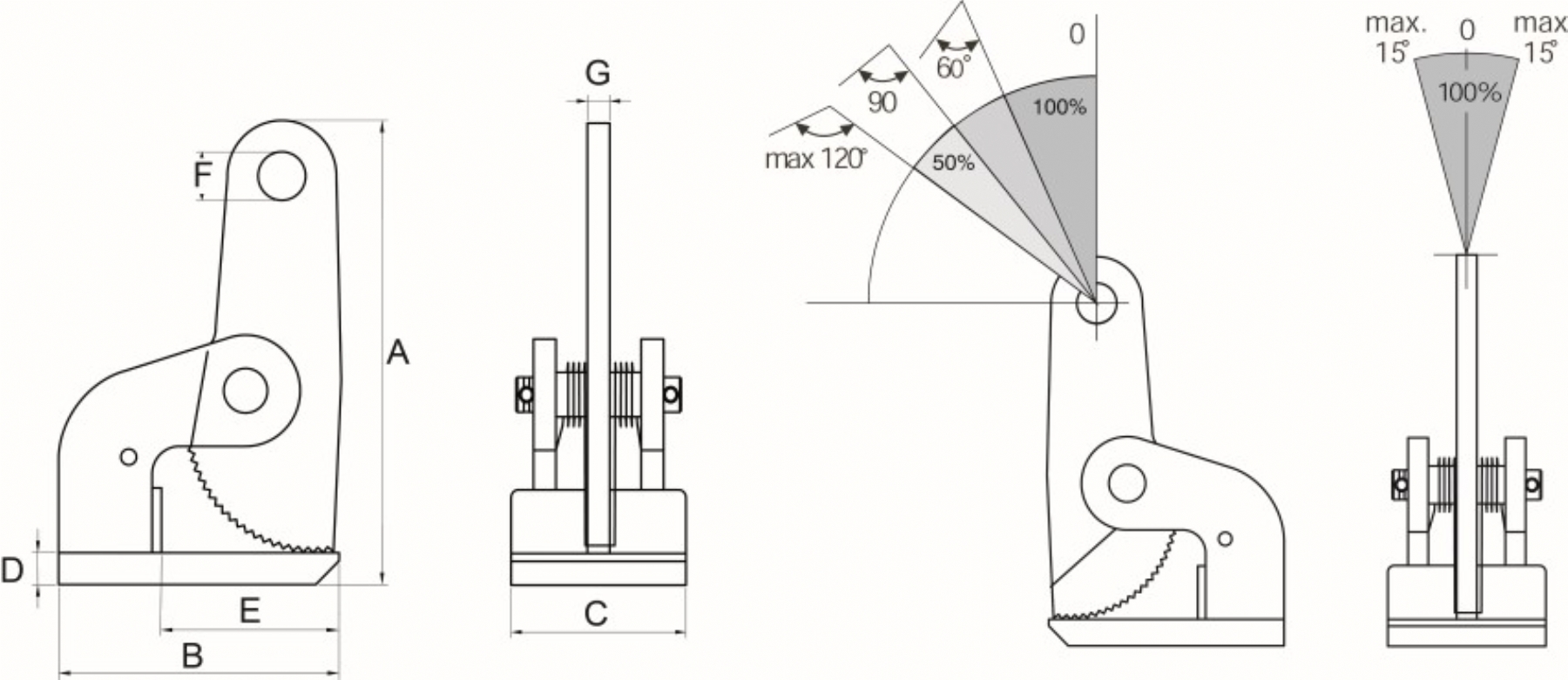 | Artikel nr. | Type | Veilige werklast (Kg) | Bek-opening (mm) | A (mm) | B (mm) | C (mm) |