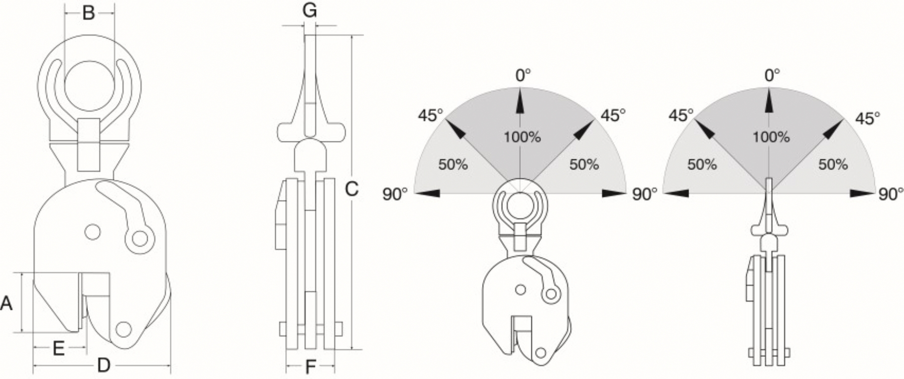 | Artikel nr. | Type | Veilige werklast (Kg) | Bek-opening | A (mm) | B (mm) | C (mm) |