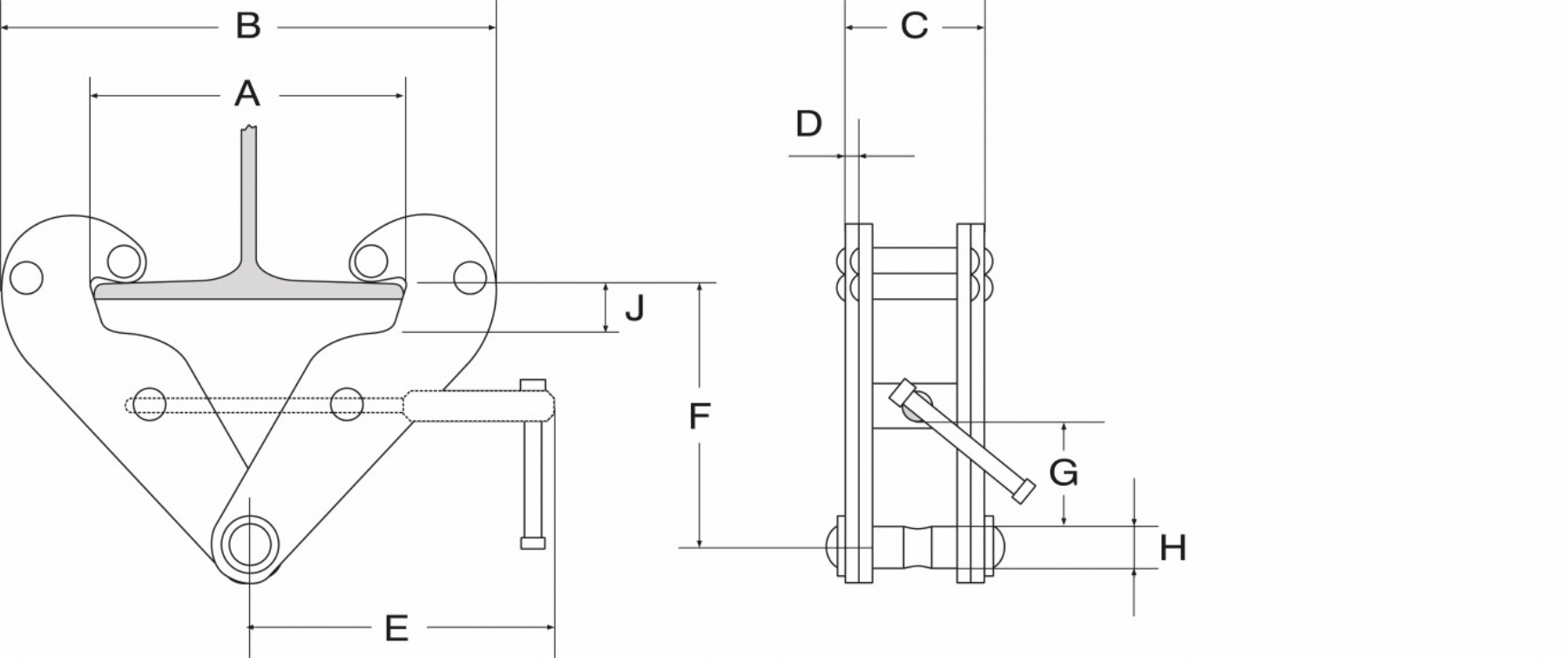 | Artikel nr. | Type | Veilige werklast (Kg) | Bek-opening (mm) | A max (mm) | B max (mm) | B min (mm) | C (mm) | D (mm) |